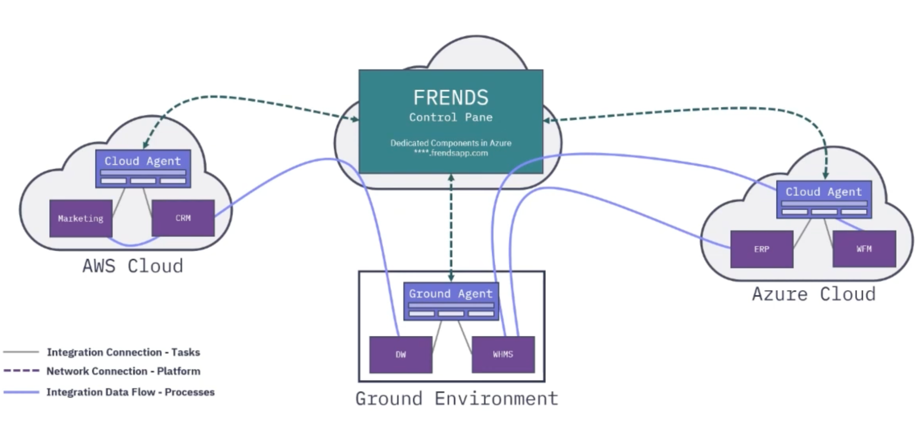 An example of FRENDS's distributed architecture for a hybrid multi-cloud environment is shown below.
