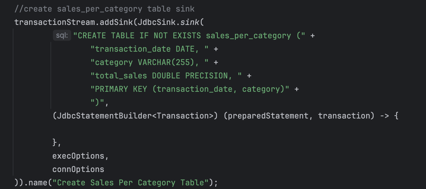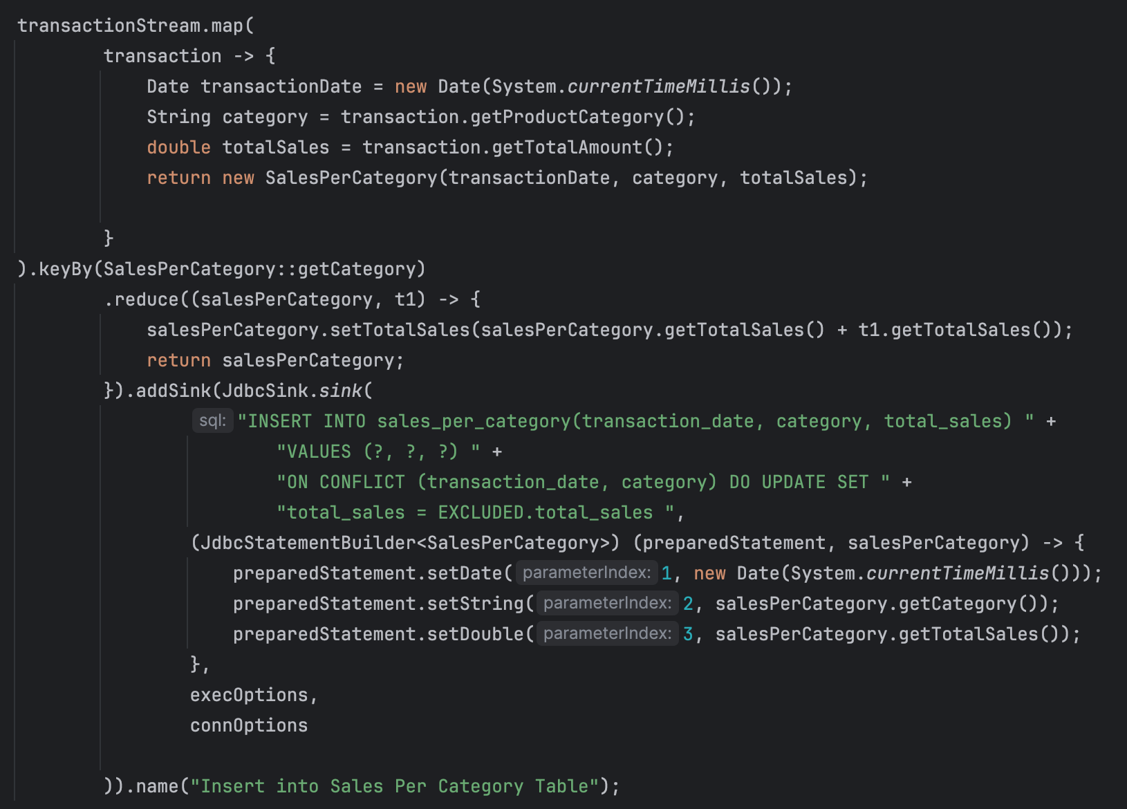 - The aggregated sales data is then written to a database table using a JDBC sink. The sink inserts new records or updates existing records if there is a conflict (i.e., if the same transaction date and category already exist).