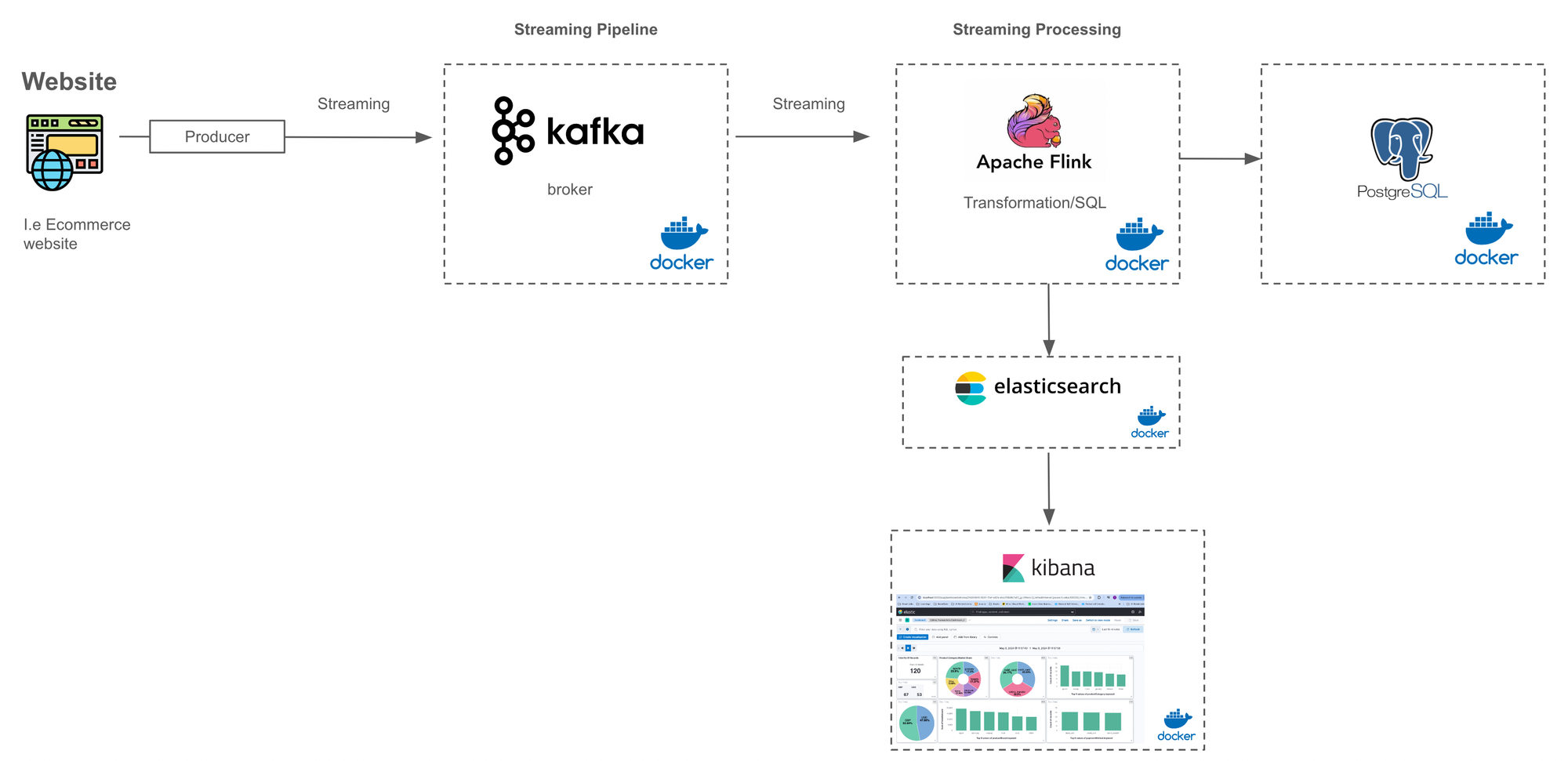 Tools used : Docker, Kafka(Confluent), Maven, Apache Flink, Postgres, Elasticsearch, Kibana.